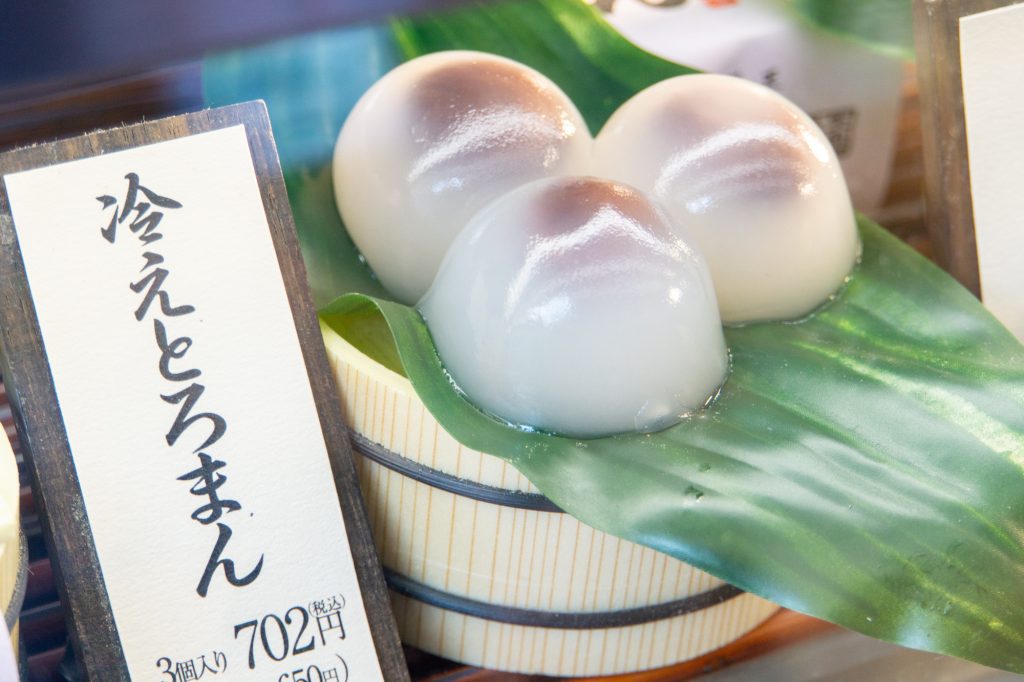 「あぶりみたらし」以外にも和菓子がたくさんありまして、今の時期、お店の方のオススメは「冷えとろまん」なんだとか!