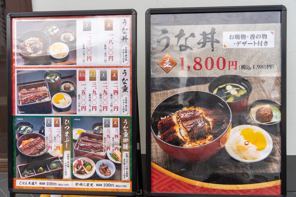 店頭にあったメニュー。うな丼並が1980円。うな重やひつまぶしなどもあるようですね〜。