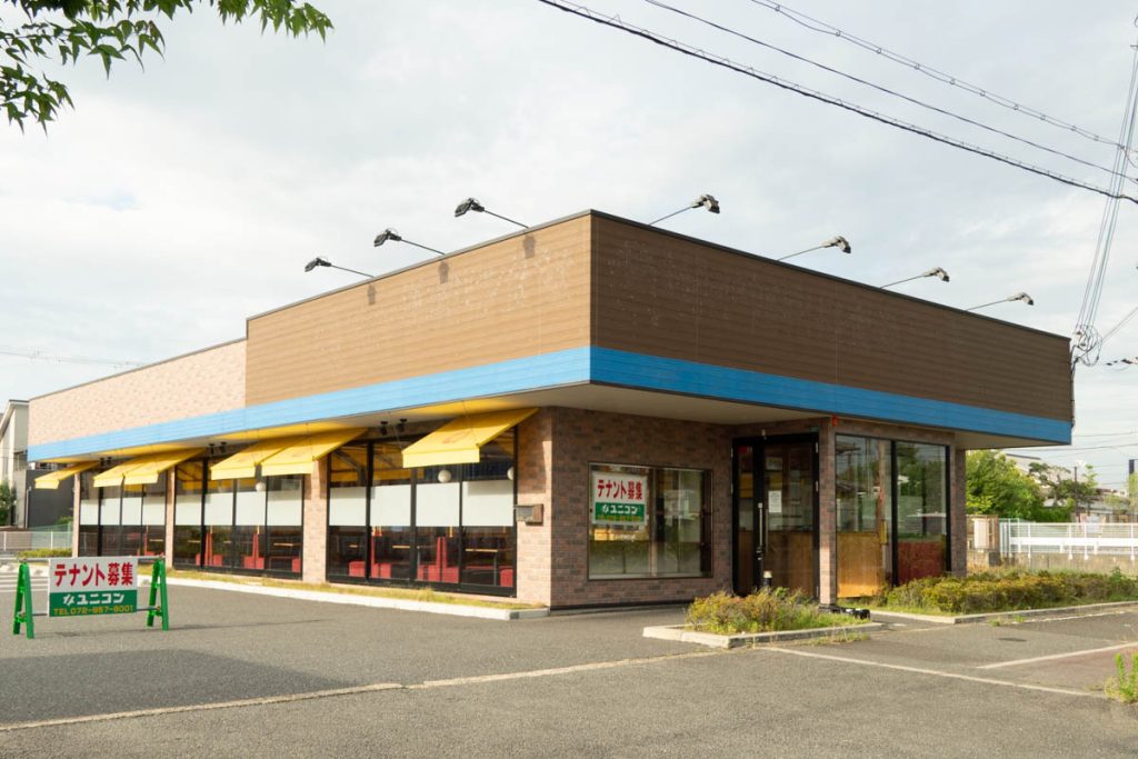 貼紙などは見当たらず、いつ頃閉店になったのかは不明ですが、見に行った際はすでに看板は外されていてテナント募集の看板と貼紙が。公式サイトの店舗紹介ページにも「まいどおおきに食堂 西招提食堂」は見当たりませんでした。