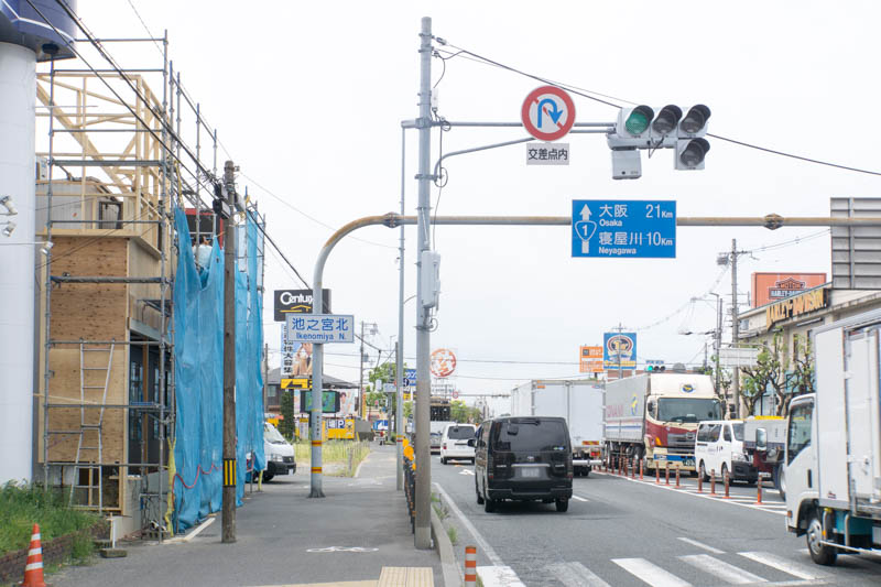交差点「池之宮北」のそばにあり、大阪方面には快活クラブやドンキホーテなどが。