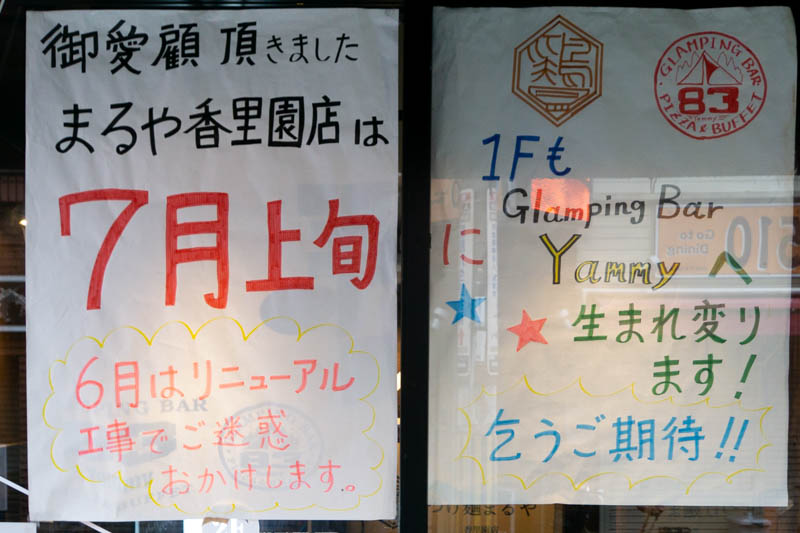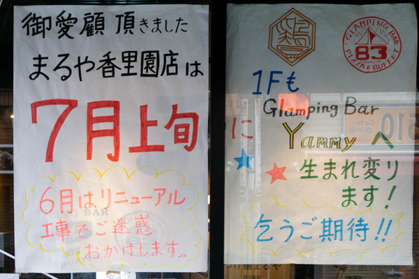 「鶏白湯専門店 つけ麺まるや」が5月末で閉店し、そこのスペースに「glamping bar83」が拡張する模様。