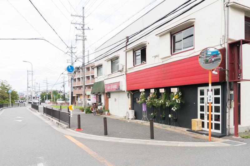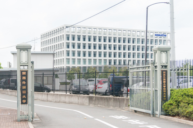 お店の道路挟んで向かいには関西外大の東門やコマツが見えます。