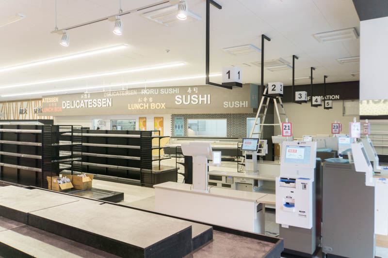 レジがありまして、セルフレジが導入されていました。奥の方には有人レジも。