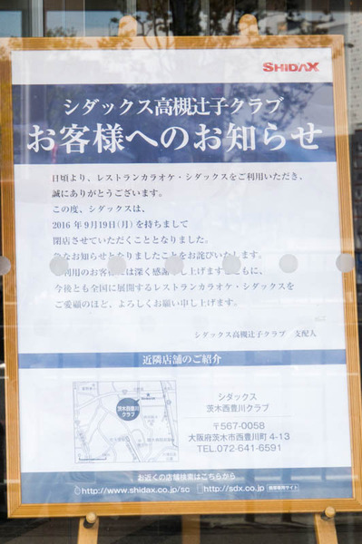 立て看板。シダックス時代の閉店に関するお知らせで、シダックスは今月の9月19日で閉店した模様。
