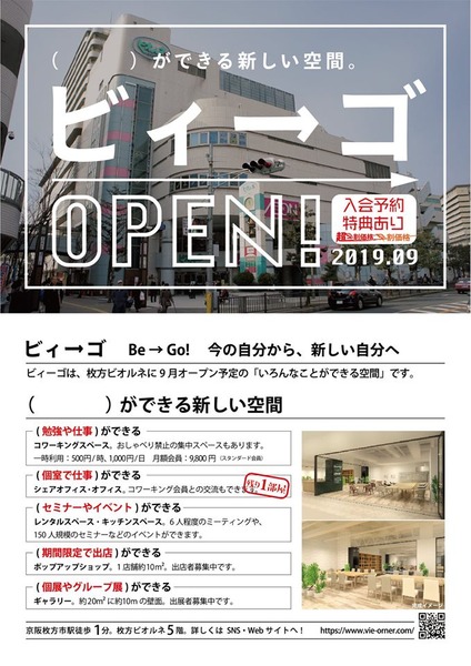 ビオルネ:仕事・勉強・イベントができるコワーキングスペース「ビィーゴ」が枚方ビオルネに9/17誕生!