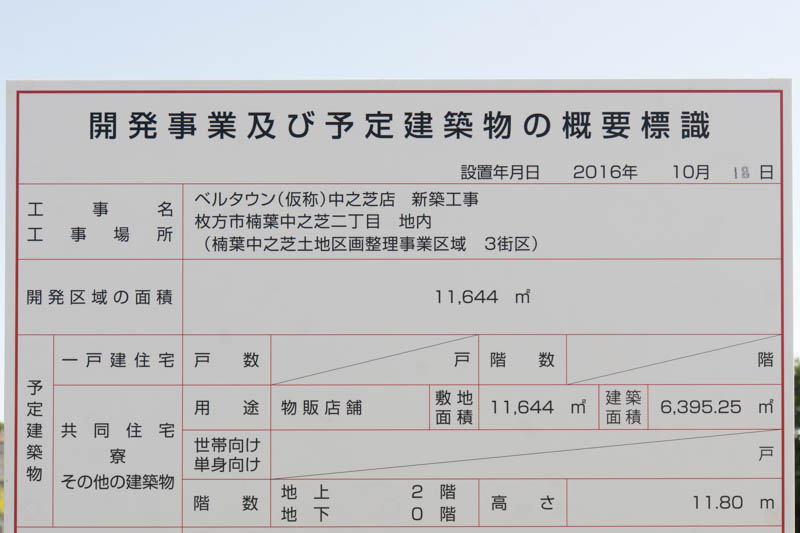 住所は枚方市楠葉中之芝2丁目で、楠葉中之芝でもかなり北の方に出来る予定です。