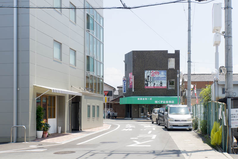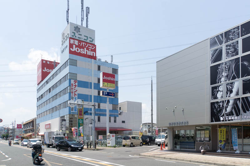 1つ上の写真の反対側から撮影した写真。左がお店で、右側にはJOSHINビルがあります。