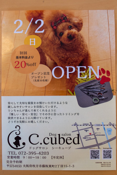 藤阪東町に「Dog salon C.cubed(シーキューブ)」というトリミングサロンができています。