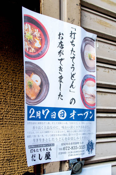 香里園にうどん店「打ち立てうどん だし屋」ができるようです。