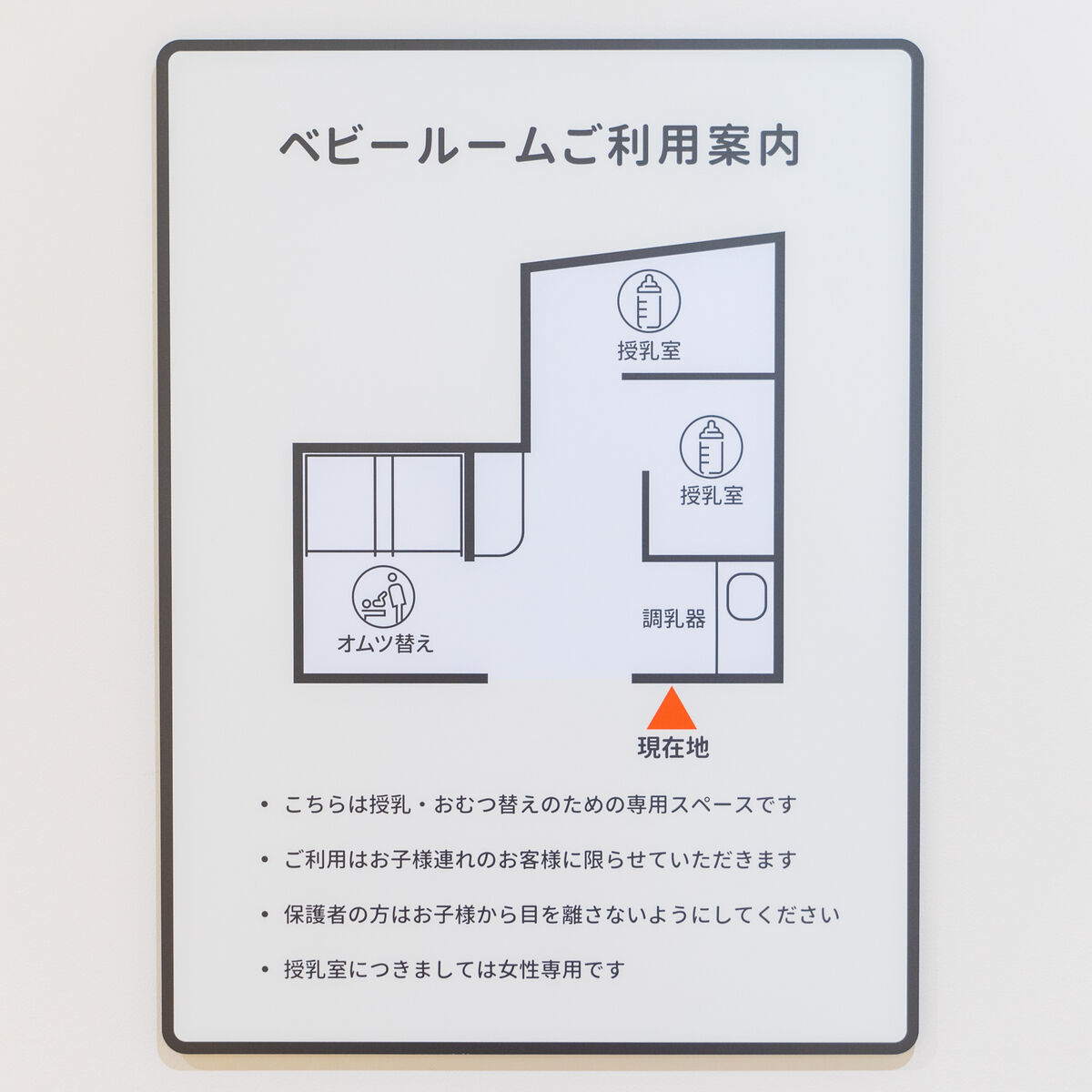 2階のトイレには男女ともに利用可能なベビールームがありまして、調乳器やオムツ替えスペース、授乳室(これは女性限定)などがあります。