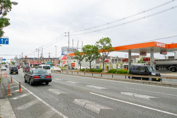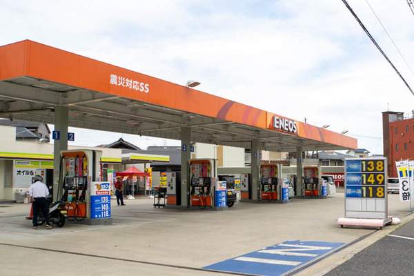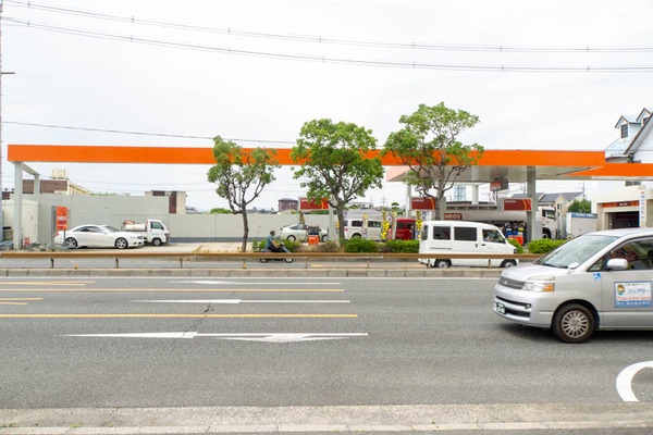 奥に見えているENEOSは、同じENEOSでもセルフのガソリンスタンド。今回リニューアルしたENEOSは有人スタンドなので、気分によって使い分けができそうですねー。