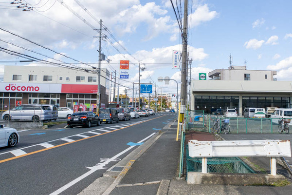 その交差点のそばには、にぎり長次郎やファミリーマート、ジーンバイクスがあります。