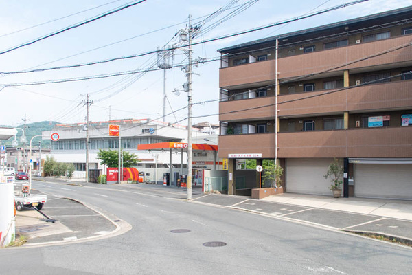 こっち直ぐ横にはエネオスがあり、進んでいくと交差点が。近くにはローソンなどがあります。