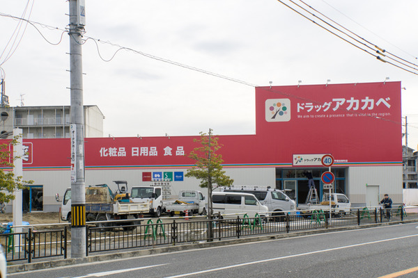 パッと見た感じでは、空いているスペースは左の建物と右の「アカカベ薬局」と書かれた建物の左側部分。