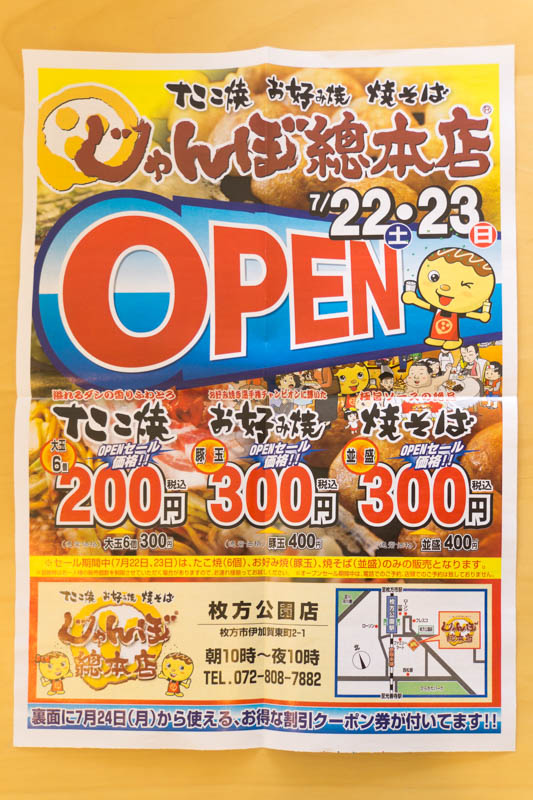 枚方公園駅前に作っていた粉もん店「じゃんぼ總本店 枚方公園店」がオープンしています。