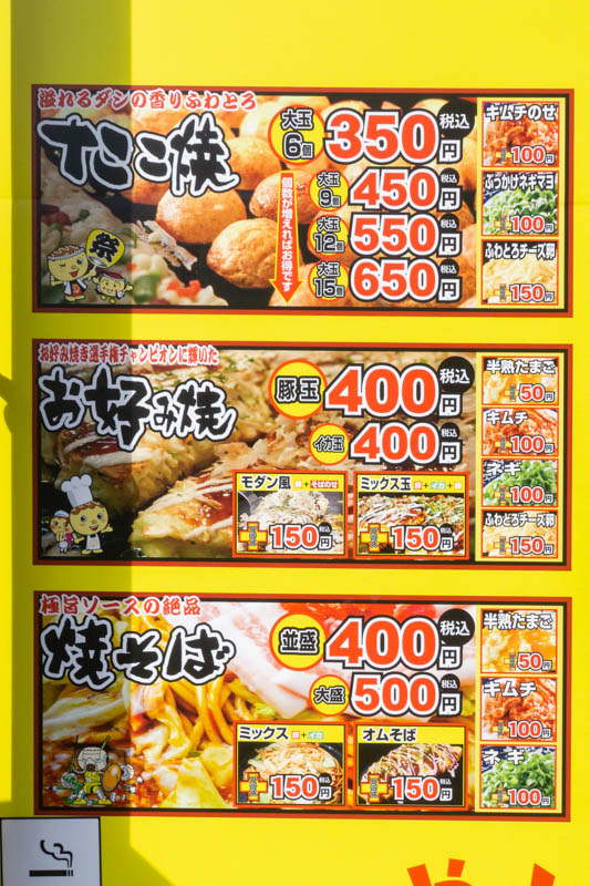 たこ焼 6個 350円、お好み焼き豚玉 400円、焼そば並盛 400円といった感じ。
