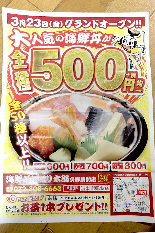 交野市駅前に税別500円均一海鮮丼のお店「海鮮どんぶり太郎 交野駅前店」がオープンしています。