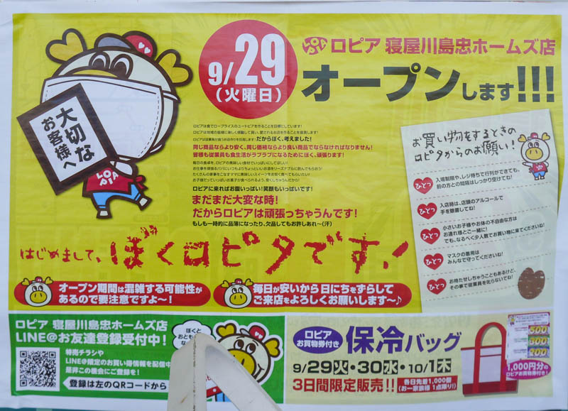 上記のお店のチラシやホームズ 寝屋川店のお知らせによると「ロピア1000円分お買物券付 保冷バッグ」を9/29(火)・9/30(水)・10/1(木)の3日間限定で販売するとのことでした。