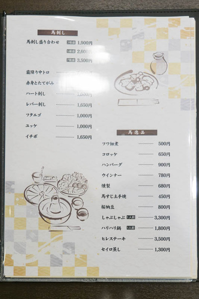 馬料理のメニュー。メニューに関しては今後変更があるそうです。