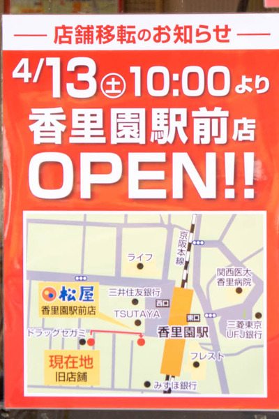 これによると4月13日に移転オープンするとのことです。店名も香里園店から香里園駅前店に。