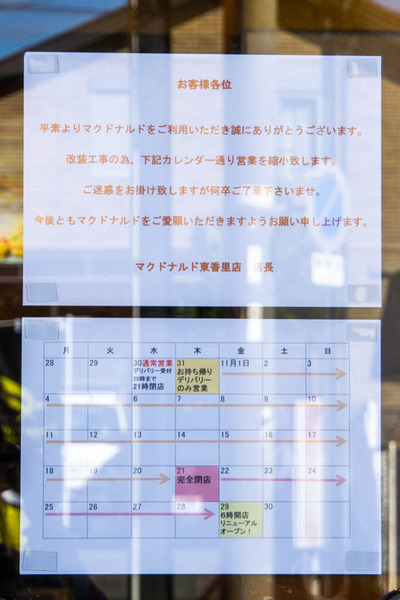府道18号線沿いにある東香里のマクドナルドがリニューアルのため改装工事をしています。