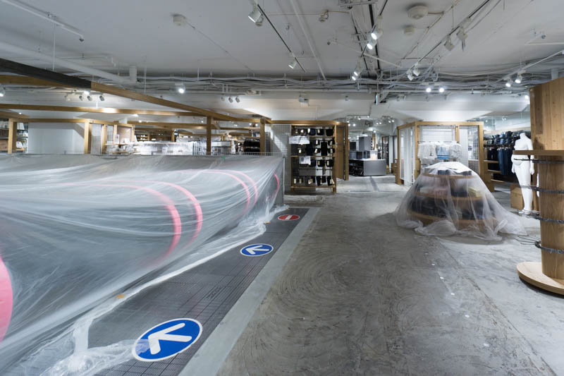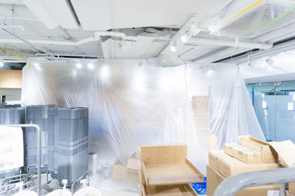 右側のカフェスタンドのコーナーはビニールに包まれていて謎な雰囲気に。