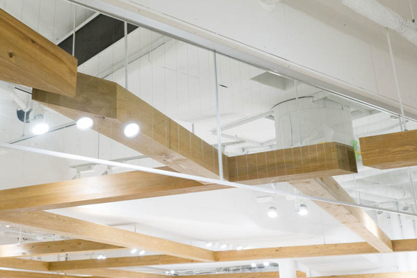 このガラスの板は防火の都合上設置しないといけないモノらしいんですが、柱の木も見事にそれに対応して切断されているよう。