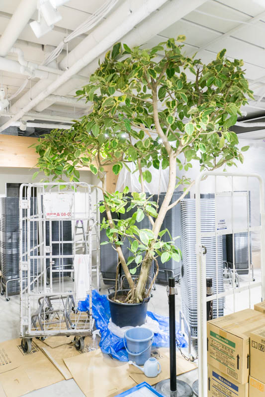 その隣にはシンボルツリークラスの大きさの、おそらくフィカス・アルテシマ(ゴムの木)だと思われる観葉植物がありました。天井まで届きそうです。
