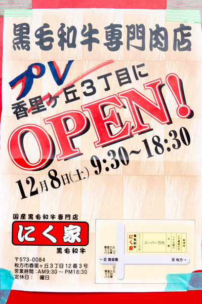 けやき通り沿い香里ケ丘に作っていた「黒毛和牛専門店 にく家」がプレオープンしています。