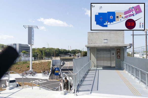 写真中央がさきほどの府道側出入り口で、そちらから来る際にはエレベーターが。(カメラのヒモが写ってしまってすみません。)