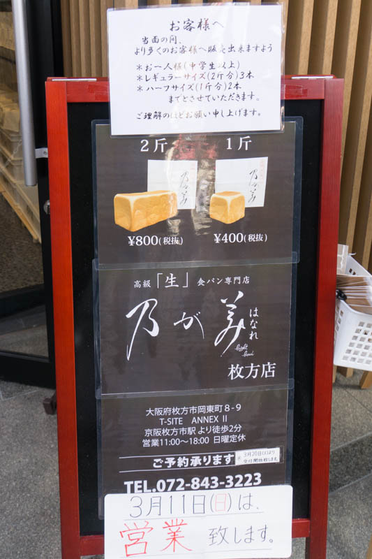 枚方T-SITEそばに作っていた高級「生」食パン専門店『乃が美(のがみ)はなれ 枚方店』がオープンしています。