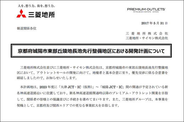 上記リンク先によると三菱地所による城陽市東部丘陵地区のアウトレットモールの開発が地権者と合意に至ったとのこと。(1年前のリリースなので、すでにご存知の方も多いと思いますが、ひらつーは最近知りました、すみません)