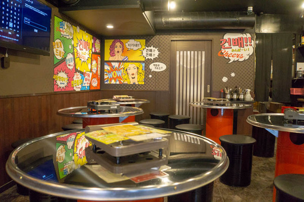 店内にはドラム缶の椅子と机が。公式サイトによると掘りごたつもある模様。K-POPが流れていました