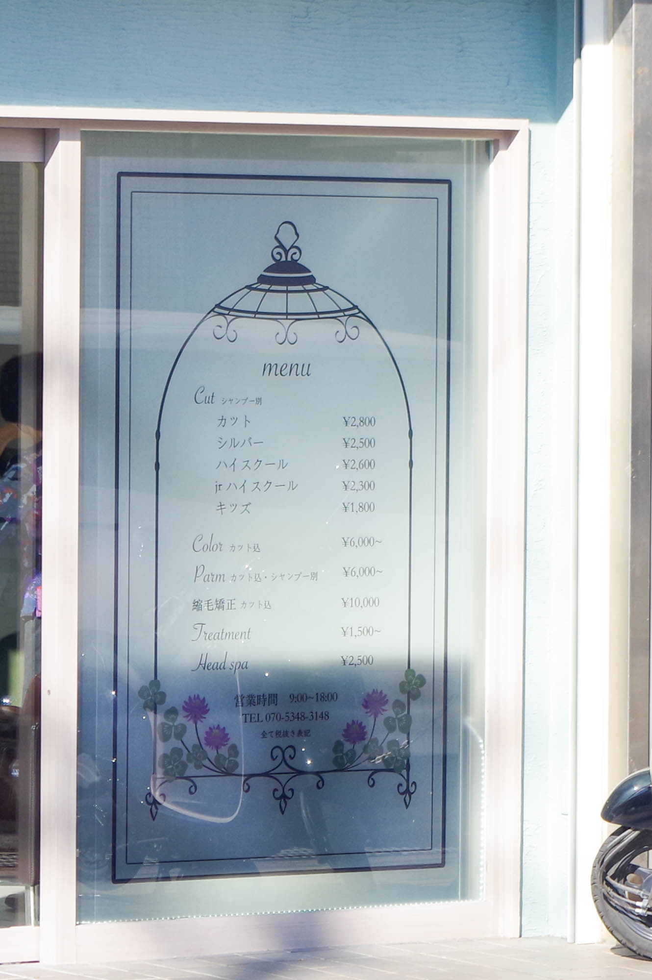 カット 2800円、カラー 6000円〜、パーマ 6000円〜。
