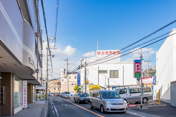 反対方向の隣には、昨年末コインパーキングとなった枚方信用金庫の駐車場があり、進んでいくと関西外大の東門やコマツ、中央図書館などの方へ。