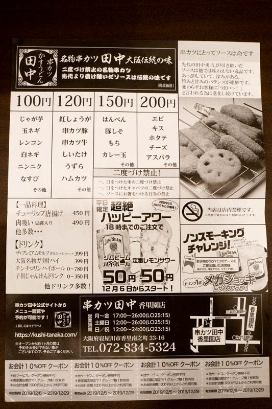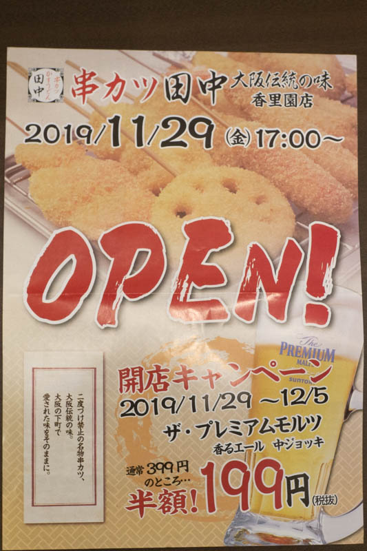 香里園に作っていた串カツのお店「串カツ田中 香里園店」がオープンしています。