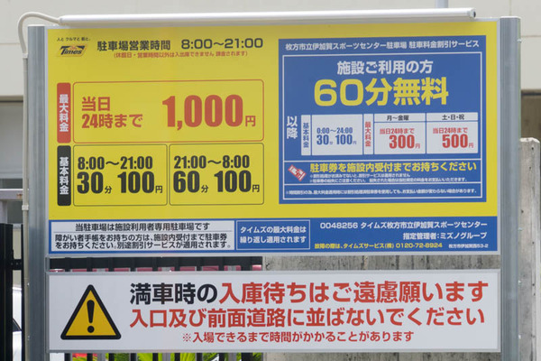 伊加賀スポーツセンターの駐車場がコインパーキング「タイムズ 枚方市立伊加賀スポーツセンター」になっています。