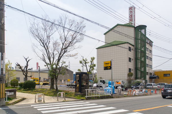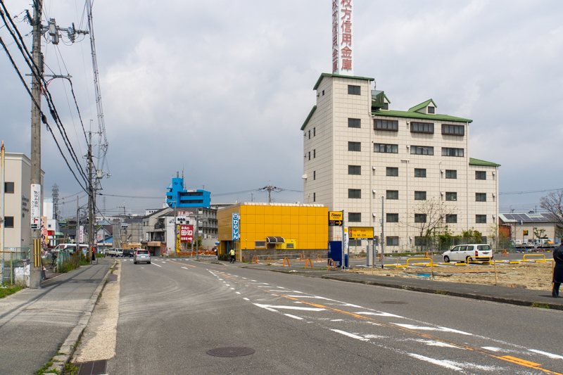 こっちには隣に黄色い建物の枚方信用金庫があり、そのまま道なりに進んでいくと国道1号線に出ます。