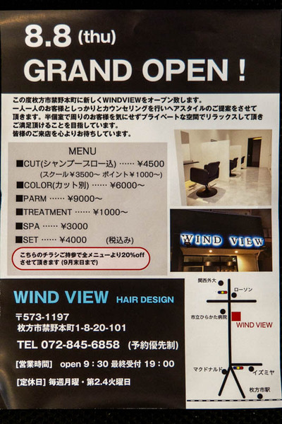 府道144号線沿い禁野本町に「WIND VIEW」という美容室ができています。