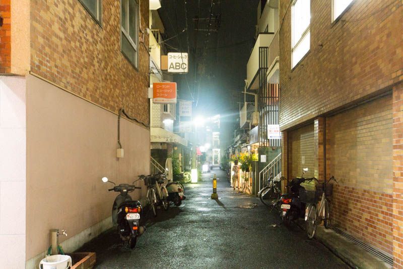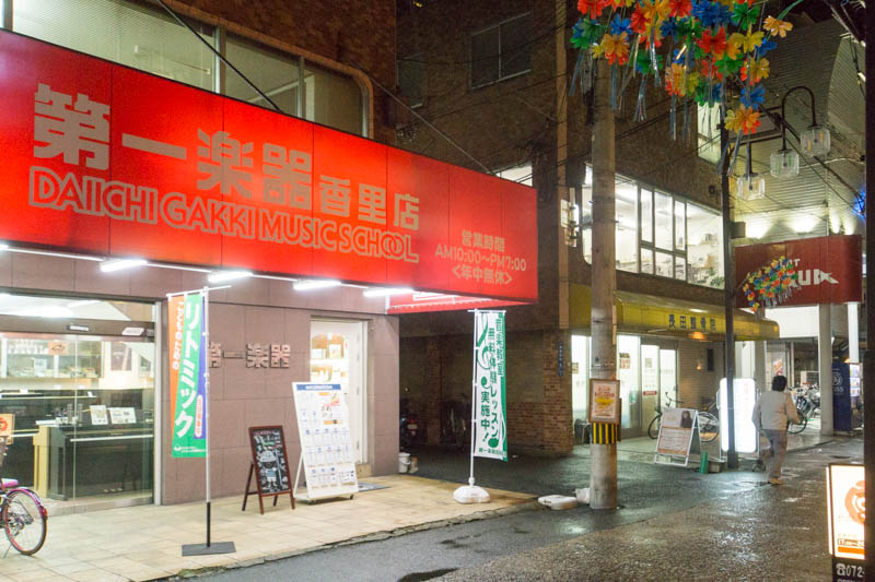 写真左側の第一楽器香里店と右側の黄色い看板、長田整骨院の間の道に入ります。