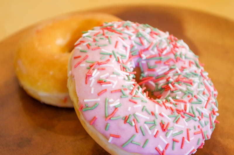 手前がストロベリーチョコ スプリンクル。 11月11日〜12月25日の期間限定のようです。(→公式サイト)奥が定番のオリジナル・グレーズド。