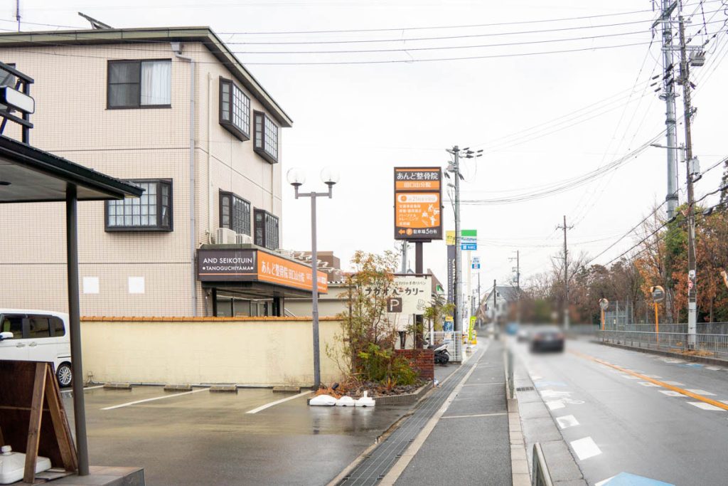 反対方向に行くとファミリーマート、ずんべら屋、フレッシュバザールなどが。長尾駅方面です。