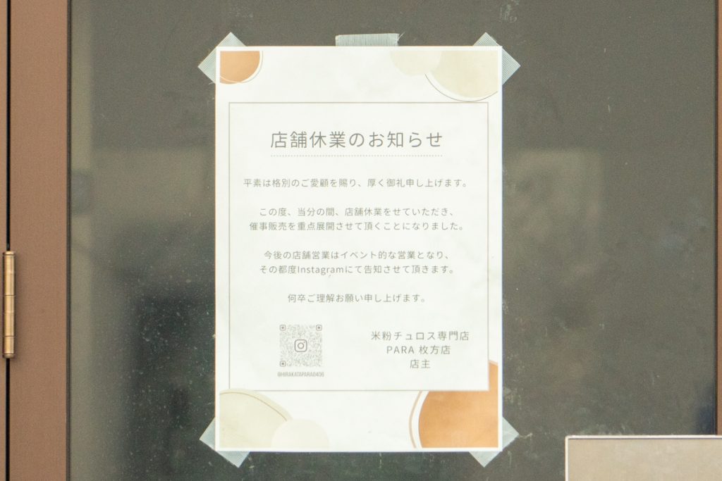 上記の現地にあった貼紙を見てみると、催事販売を重点展開するため当分の間休業することが書かれています。