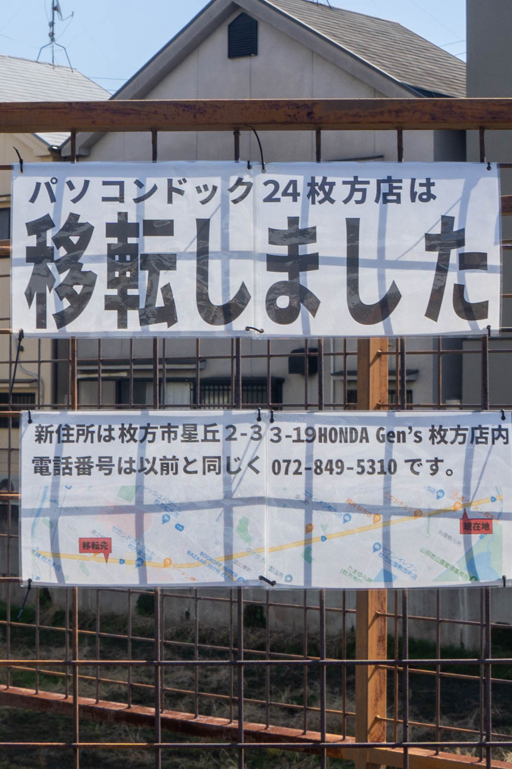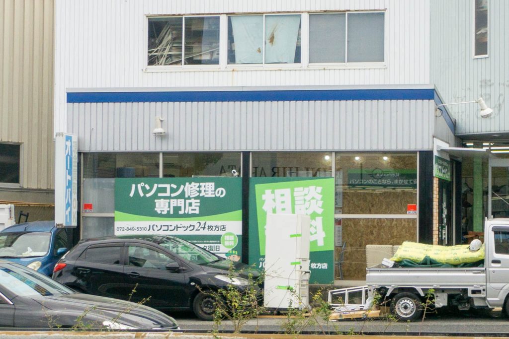 1号線沿いの「パソコンドック24 枚方店」があった建物が取り壊されています。