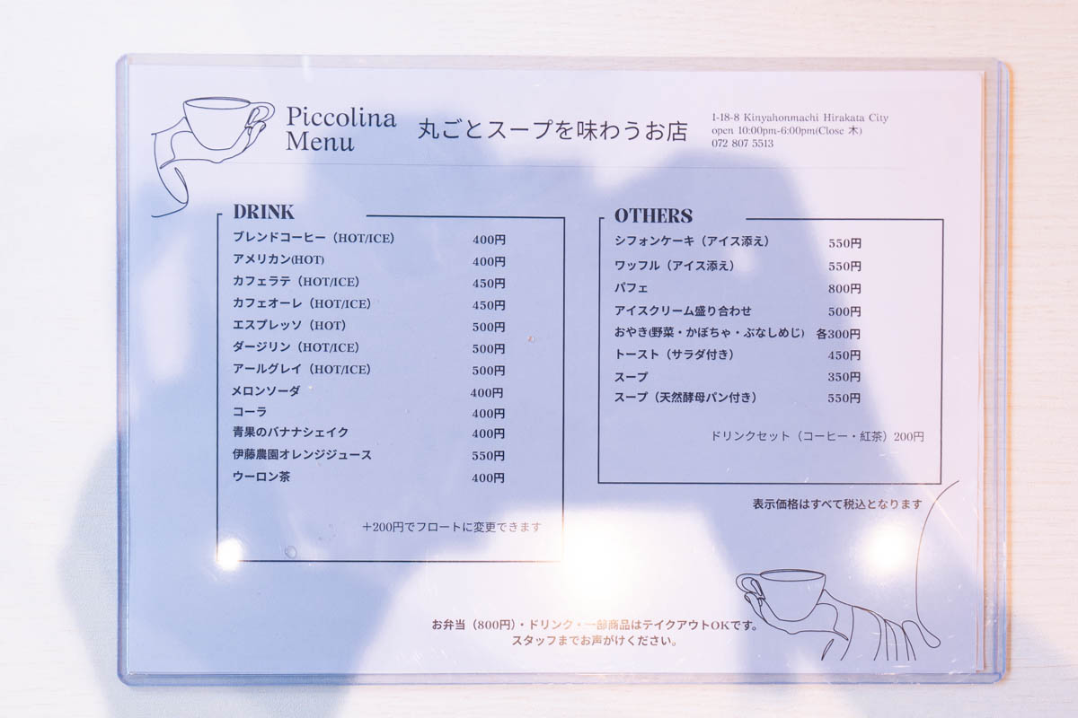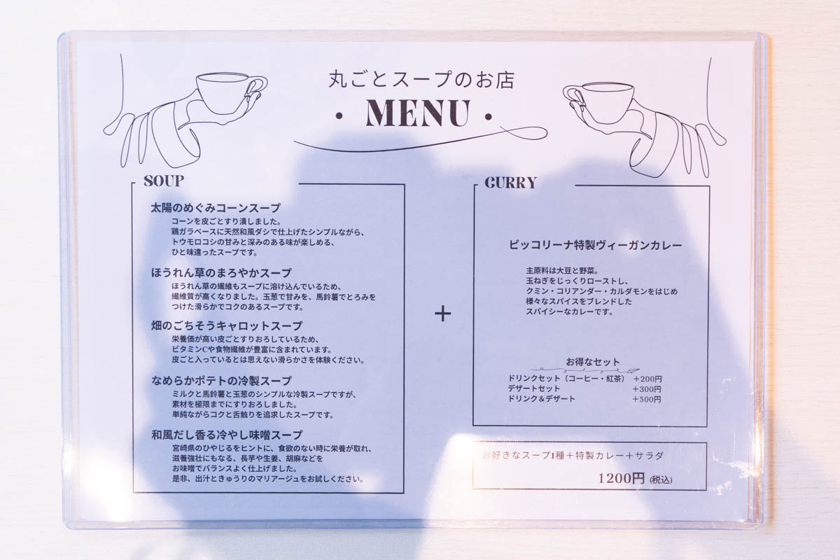 メニュー。丸ごとスープとヴィーガンカレーのセット気になる。現時点ではヴィーガンカレーは1日10食限定とのことですが今後変更になる可能性もあるそうです。