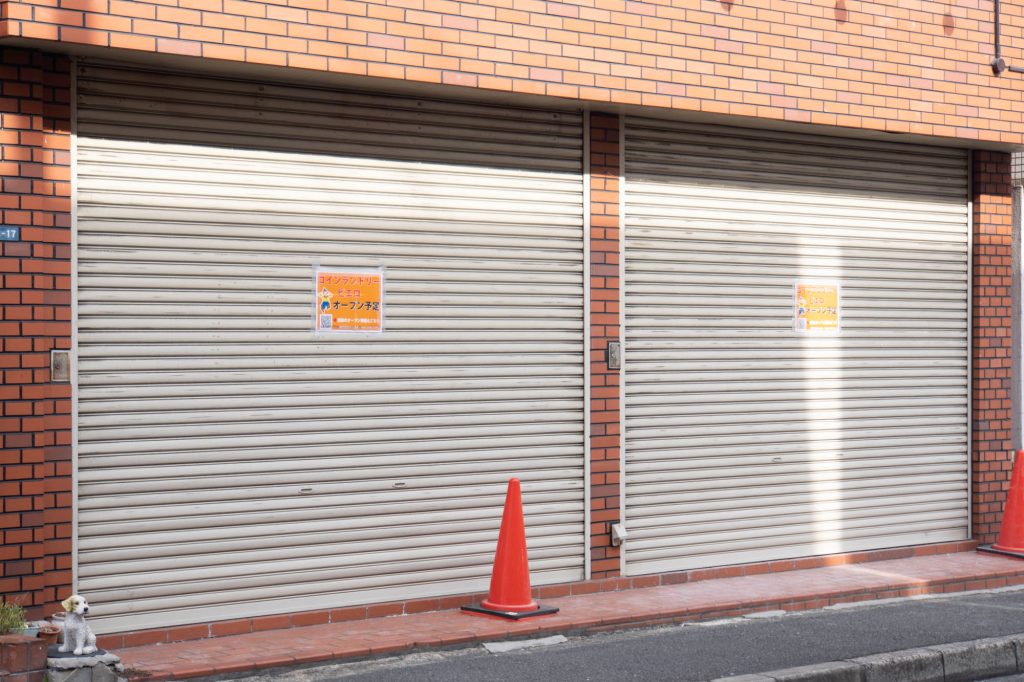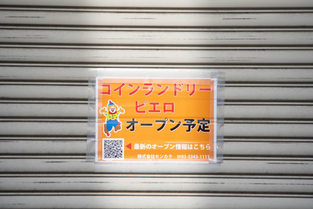 貼紙によると「ピエロ」というコインランドリーができるとの記載が。