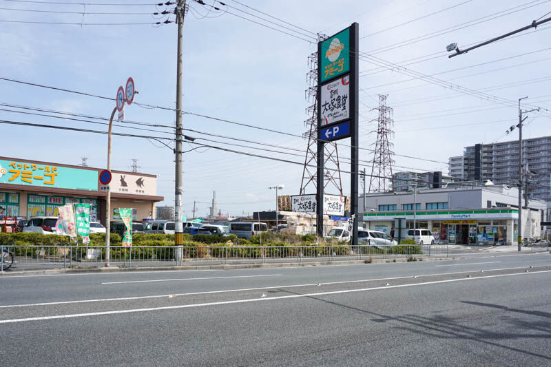 同じ場所にはファミリーマート、隣にはペットショップ「アミーゴ」が。