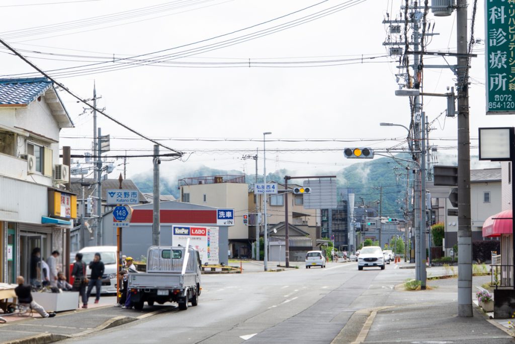 こっちに行くとすぐそこの信号で国道168号線が交差していて、そのまままっすぐ道なりにいくと交野市駅の方へ。