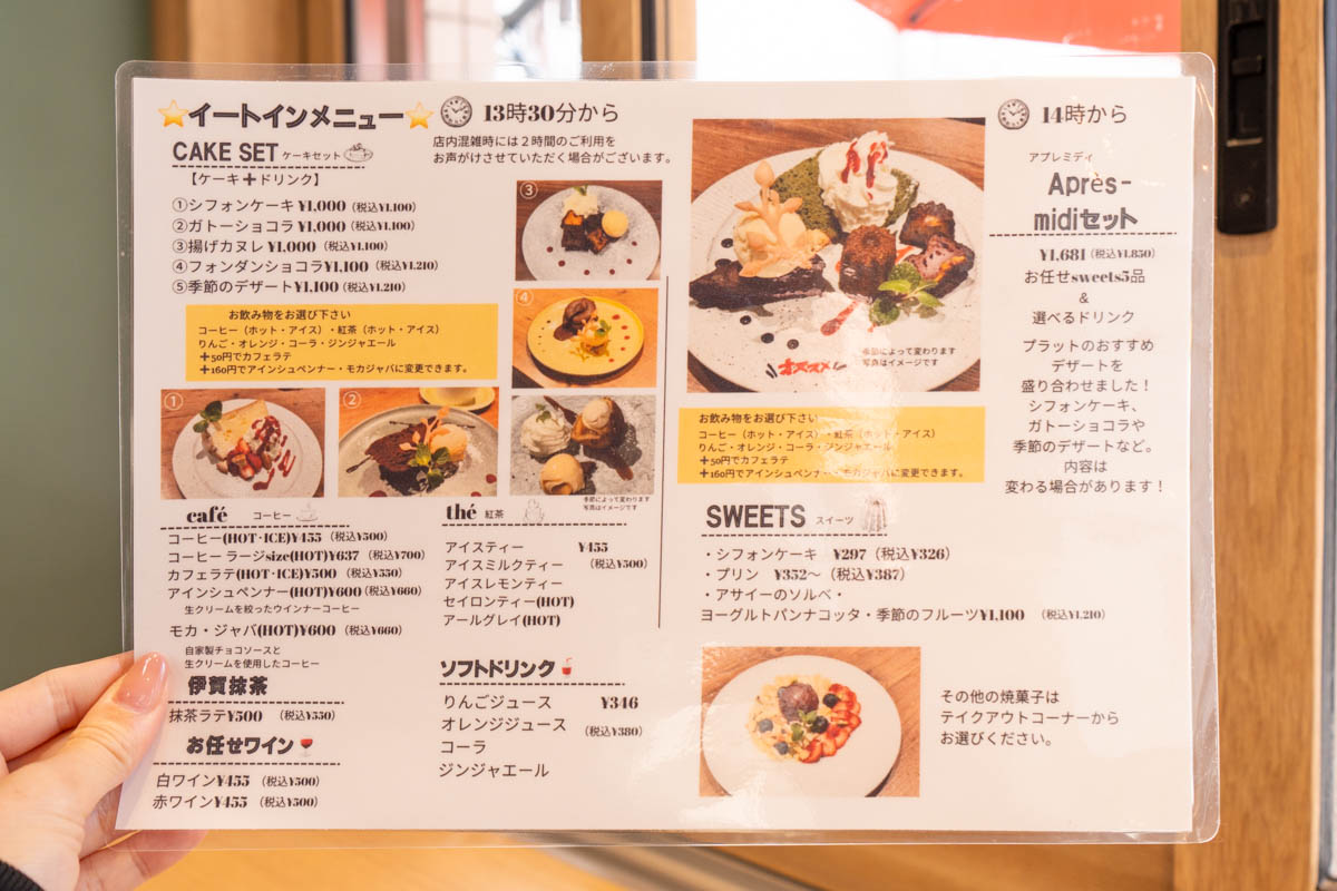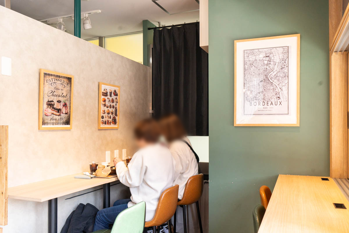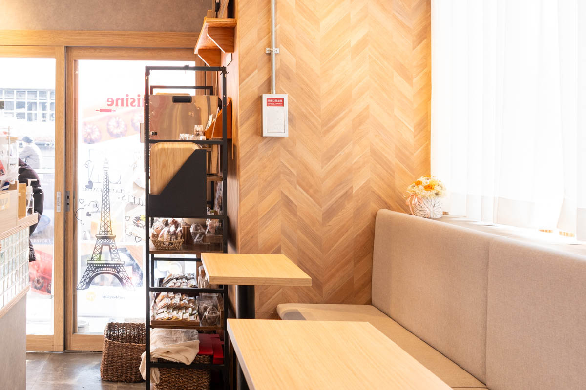 カウンター席やソファ席、外にテラス席もあります。テイクアウトの洋菓子もたくさん置かれていました。