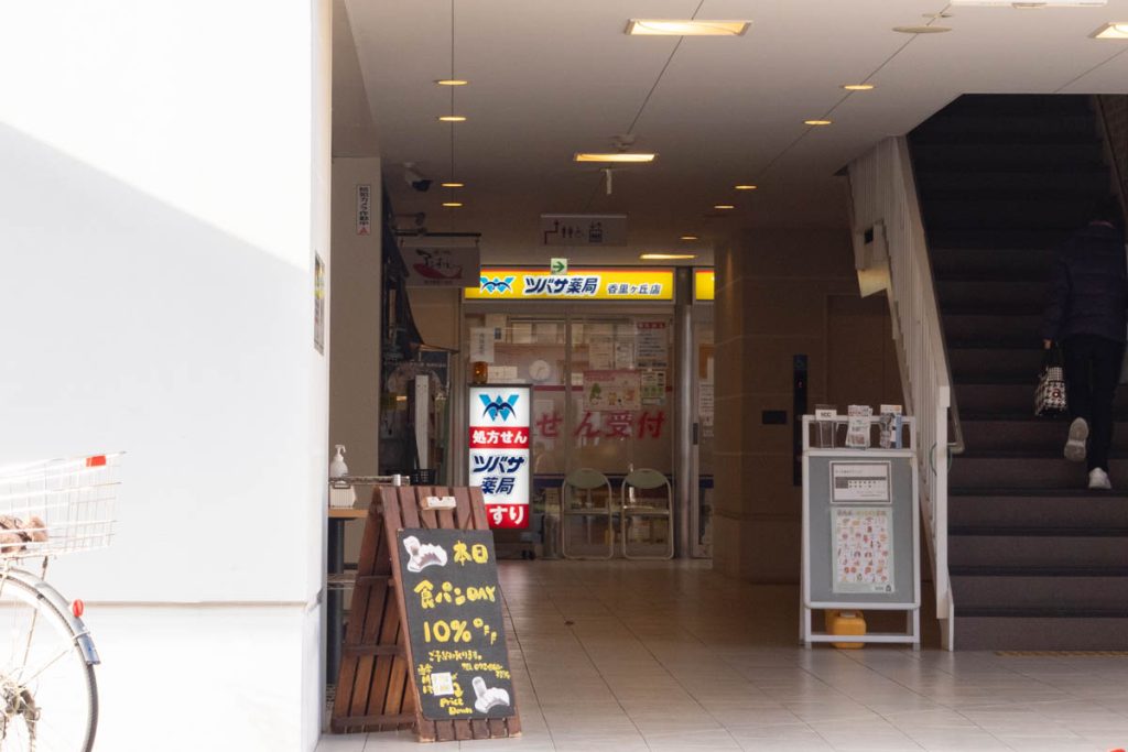 場所はCONOBA香里ヶ丘1階の「煮干し拉麺 アンチョビー」の前あたりで、右に映っている階段の下にありました。